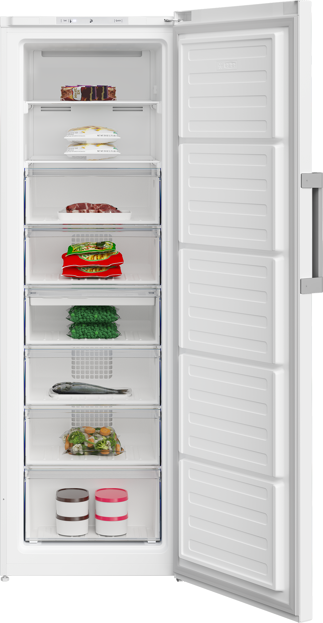 Морозильный шкаф Beko B1RFNK312W в лаконичном белом корпусе оснащен 2 открытыми полками из закаленного стекла, 6 выдвижными ящиками и поддоном для мелких продуктов. Перенавешиваемые двери позволяют изменять направление открытия в соответствии с планировкой кухни. Технология No Frost исключает появление наледи даже в режиме суперзаморозки при выборе температуры -24 °C.Beko B1RFNK312W оснащен удобным сенсорным управлением и небольшим дисплеем. Модель подает визуальный сигнал при повышении температуры, что происходит из-за открытия дверцы или долгого отключения электричества. Надежная конструкция позволяет использовать морозильный шкаф для работы в неотапливаемых помещениях.