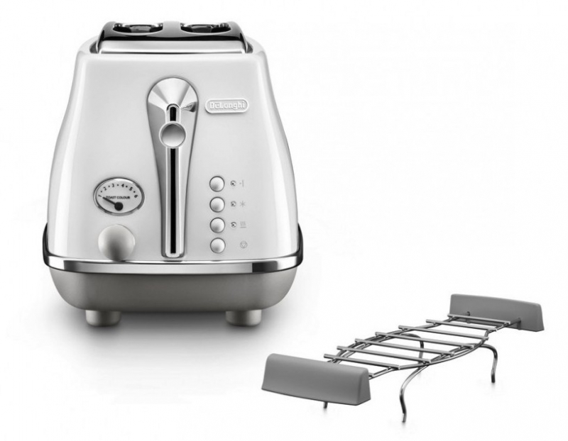 Тостер DeLonghi CTOE2103.W имеет корпус из нержавеющей стали с хромированными элементами. Матовая текстурированная поверхность делает тостер роскошным. Решетка данной модели предназначена для разогрева булочек, круассанов. Также прибор умеет подогревать остывший тост, имеет функцию отмены и поджаривания тостов с одной стороны. Функция «экстра-подъем» поможет аппетитно зажарить даже маленькие кусочки хлеба. Тостер имеет поддон для крошек, благодаря которому за ним легко ухаживать. Просто выдвинете поддон и удалите остатки хлеба. Кнопки тостера с неоновой подсветкой, что делает его еще более привлекательным. Нескользящие ножки устройства делают использование прибора комфортным. За одно приготовление ваш помощник готовит два тоста, что очень удобно.