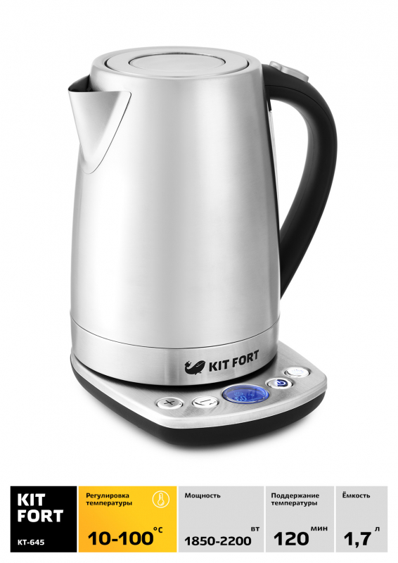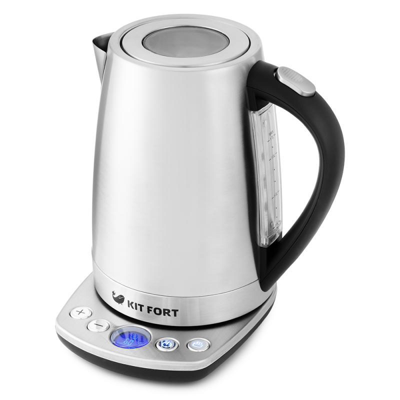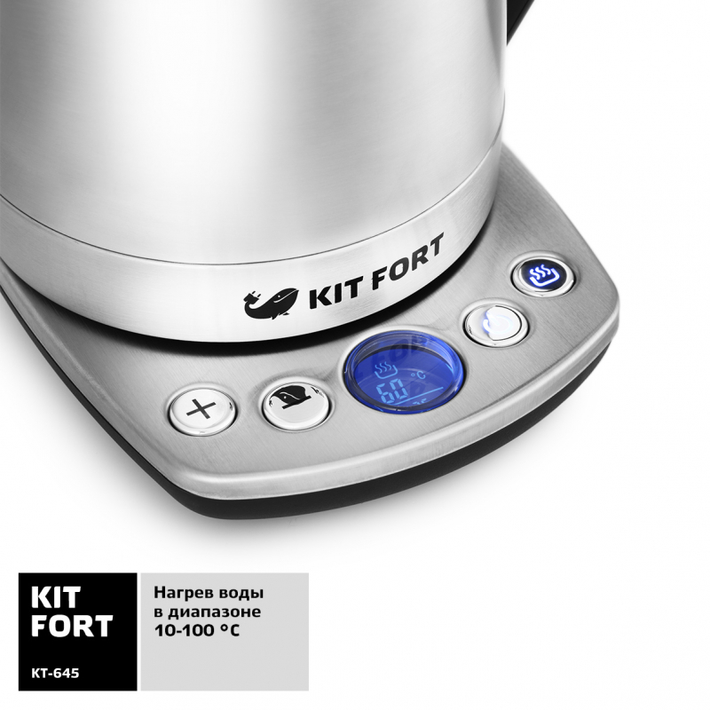 Электрический чайник с терморегулятором Kitfort КТ-645 может не только вскипятить воду, но и нагреть ее до температуры от 10 до 100 °С, что очень удобно при заваривании различных сортов чая и подогрева детского питания. Чайник также оснащен функцией поддержания температуры. Температура воды контролируется термодатчиком, встроенным в дно чайника.