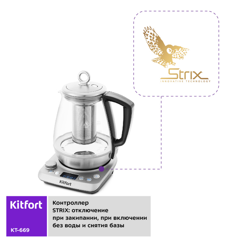 Чайник оснащён контроллером Strix - № 1 среди поставщиков компонентов для электрочайников. Он устраняет риски короткого замыкания и возгорания прибора. Обеспечивает защиту при закипании, при включении чайника без воды и при снятии с базы во время работы.