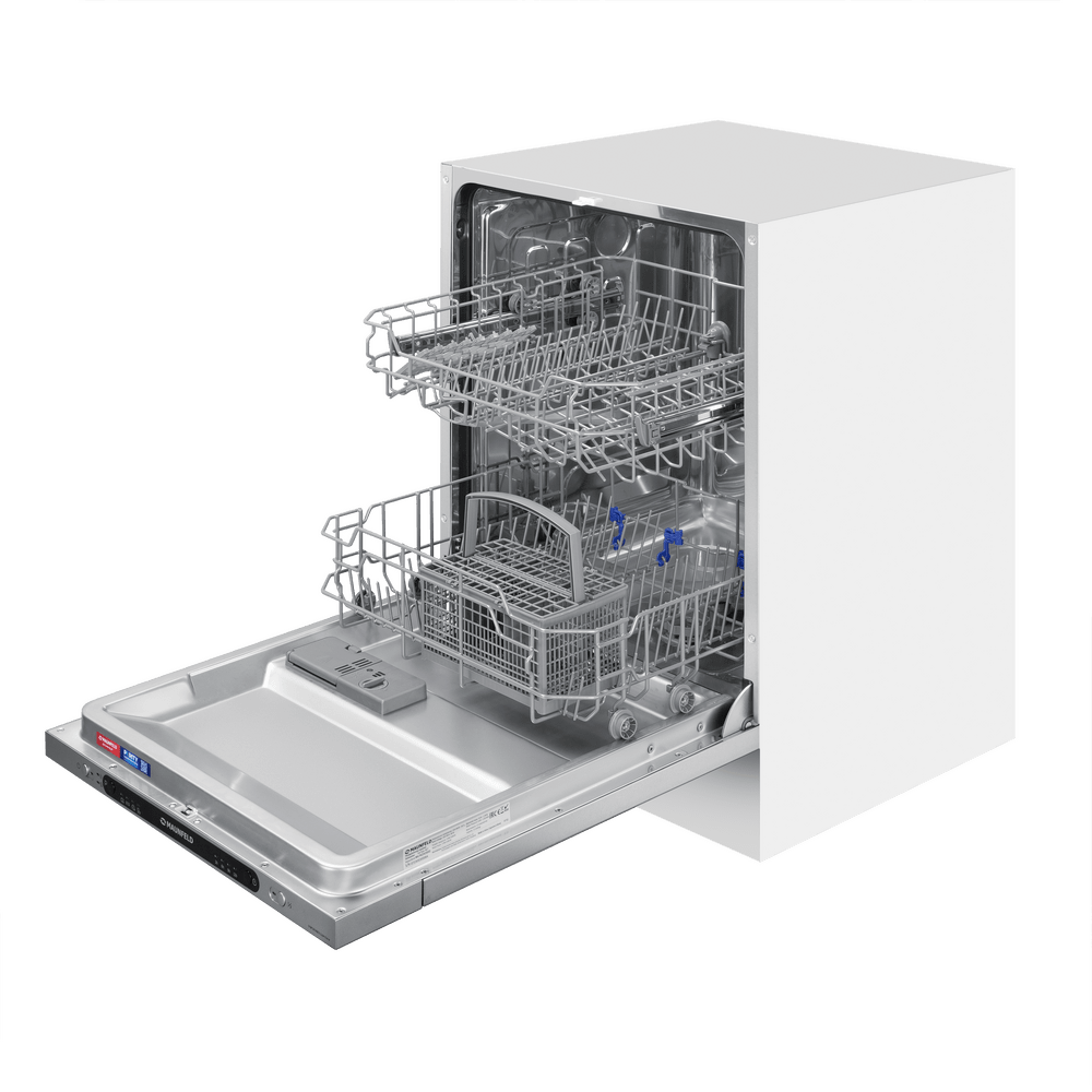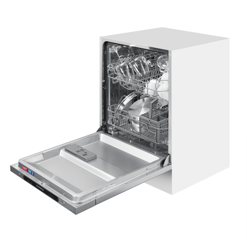 В посудомоечную машину можно поместить до 12 комплектов посуды. Возможность установки верхней корзины на разных уровнях позволит разместить посуду большого размера: кастрюли, сковородки, большие блюда. Также в верхней корзине есть складные держатели для бокалов — дополнительное важное удобство.
