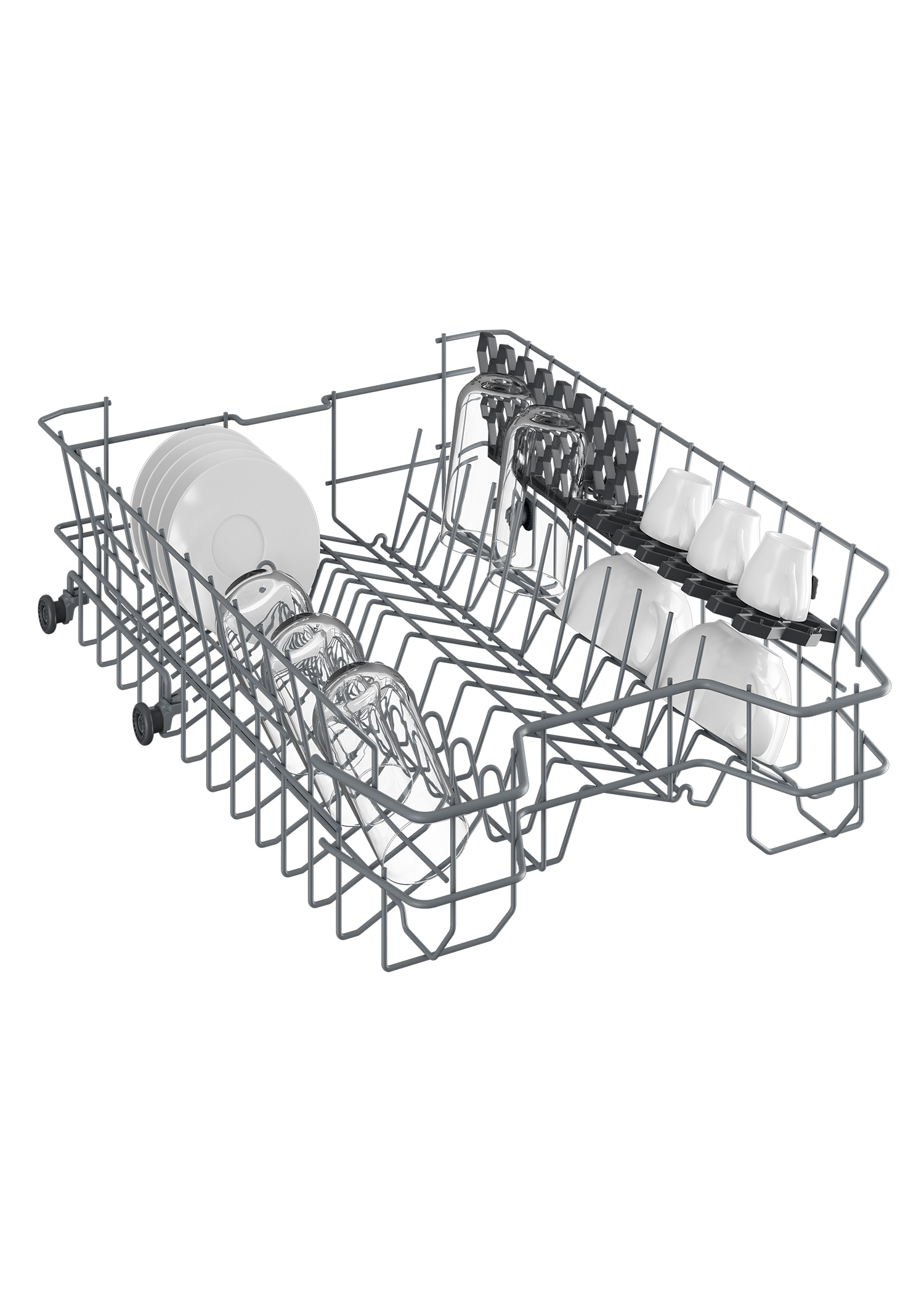 Регулируемая по высоте верхняя корзина поможет с легкостью поместить в нее не только обычные кружки, но и бокалы с длинной ножкой. А самое верхнее положение особенно поможет в тех случаях, когда предметы в нижней корзине не помещаются по высоте: например, очень глубокие кастрюли или стоящий вертикально противень.